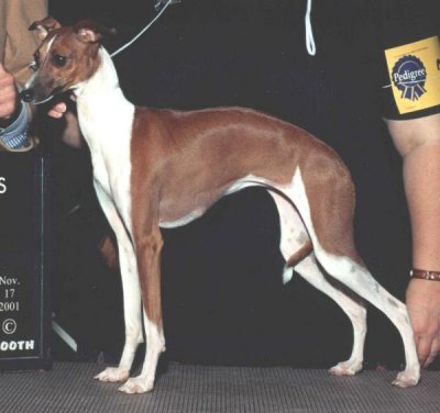 Kelly is a beautiful dark red female with white markings and a black mask. At 14 ¾ inches tall with beautiful lines, correct breed conformation, and wonderful movement; she finished her AKC championship with 3 majors. She also has her UKC championship and she is the first Italian Greyhound to get the UKC title of Grand Champion. She has many Best of Breed wins in both AKC and UKC and many group wins in UKC. In UKC she also has a Reserve Best in Breed Show win.